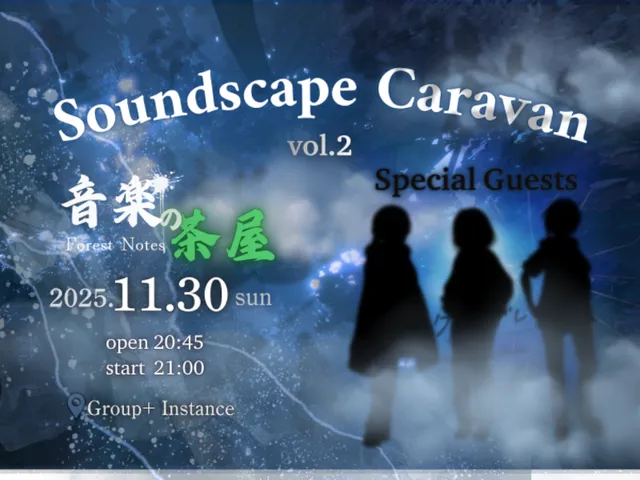・グループ『音楽の茶屋』のイベント用ワールドです。 ・ライブにはTopazChatを使用いたします。『オーディオ』『ワールド』より音量を調節してください。また、ステージ下にあるResyncボタンを定期的にクリックすることを推奨しております。 ・ライブ中は多数の演出を使用いたします。照明が眩し過ぎると感じられる方は、『設定』『ディスプレイとビジュアルの調整』『ブルーム効果の強度』より、調整してください。