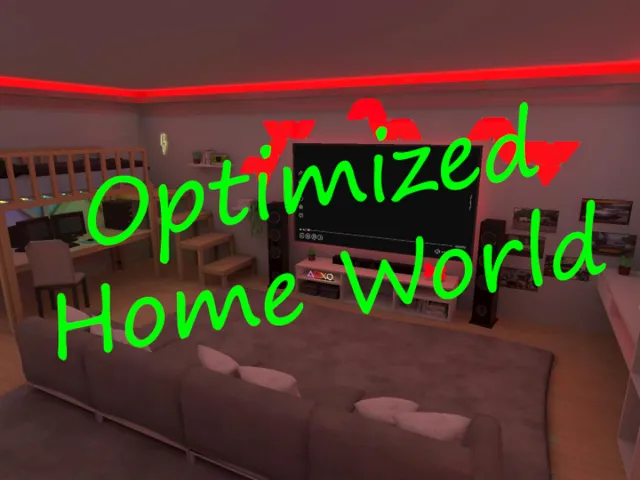 「Optimized Home World」は JoeyThePixelGuy が制作した VRChat ワールドです。Quest 対応。推奨定員 16 人(最大 32 人)。2024年7月8日 公開。2026年4月20日 更新。タグ: home、optimized、video_player、avatar、furry。