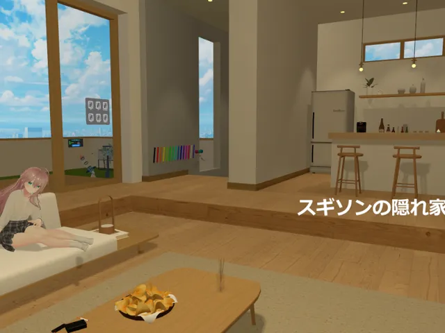 アバター改変やフレンドとくつろぐ際に使ってください。 追加してほしいものは順次追加します。壁や動画再生画面越しに奥の部屋に置いてあるフィギュア(自分のアバター)が映り込む方は、設定グラフィックスカメラのニアクリップの上書きオフに設定してください。