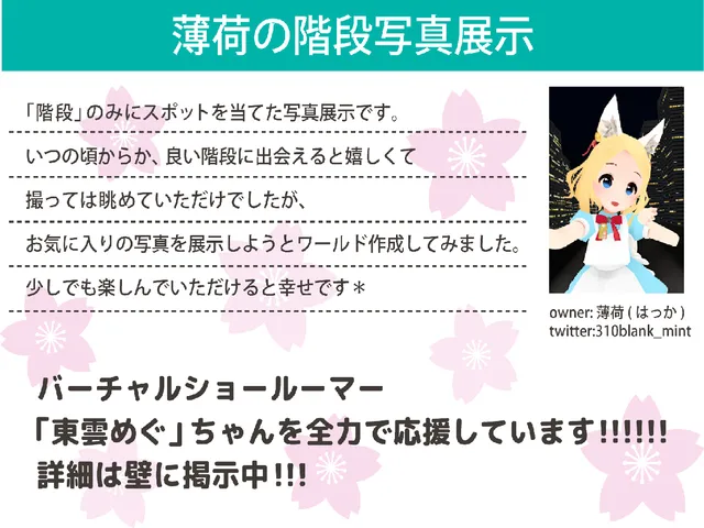 「KaidanPhotoGallery」は 薄荷(はっか) が制作した VRChat ワールドです。Quest 対応。推奨定員 10 人(最大 20 人)。2019年8月31日 公開。2019年9月5日 更新。