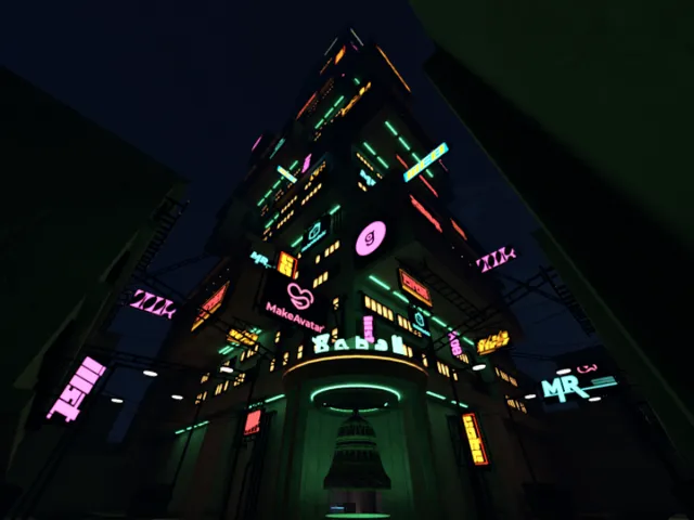 サイバーパンクをテーマとした「Project_Babell」は、多目的に利用可能なカフェバーと、広々とした動画プレイヤー付きの会議室を備えた、4階建てのワールドです。