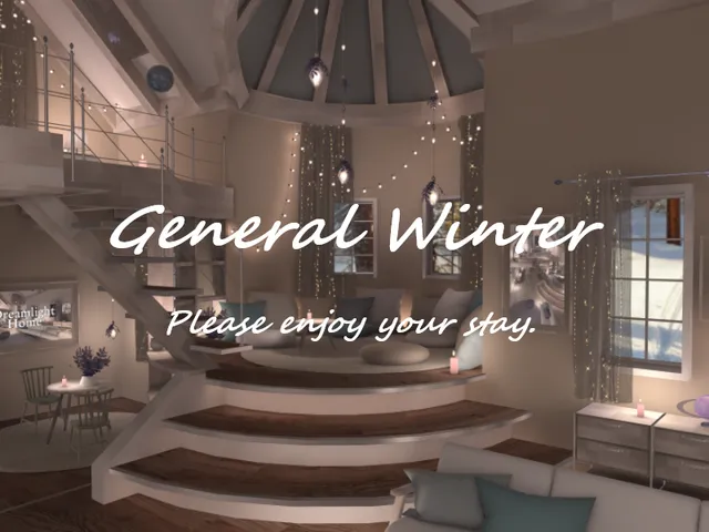 「General Winter」は Stylish@Ship2 が制作した VRChat ワールドです。Quest 対応。推奨定員 25 人(最大 30 人)。2025年12月9日 公開。2026年3月21日 更新。タグ: chill、sleep、home、cozy、color_my_world。