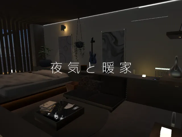 「夜気と暖家」は とら_10ra023 が制作した VRChat ワールドです。Quest 対応。推奨定員 16 人(最大 32 人)。2026年1月20日 更新。