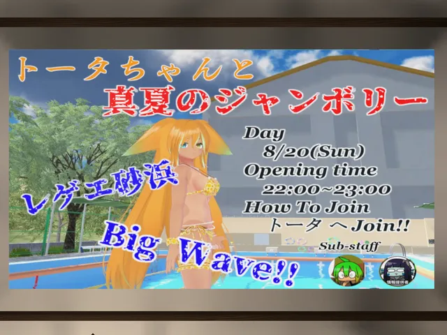 「トータちゃんと真夏のジャンボリー」は 八坂まと が制作した VRChat ワールドです。PC 専用。推奨定員 16 人(最大 32 人)。2023年8月29日 公開。2025年8月16日 更新。