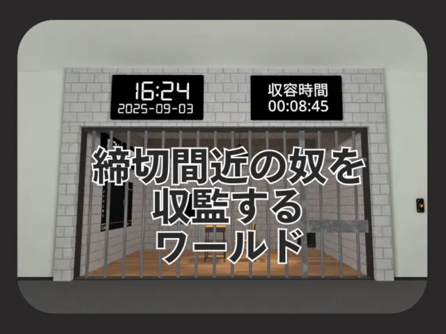 「締切間近の奴を収監するワールド」は うすあじ が制作した VRChat ワールドです。PC 専用。推奨定員 8 人(最大 16 人)。2025年9月4日 公開。2025年9月3日 更新。