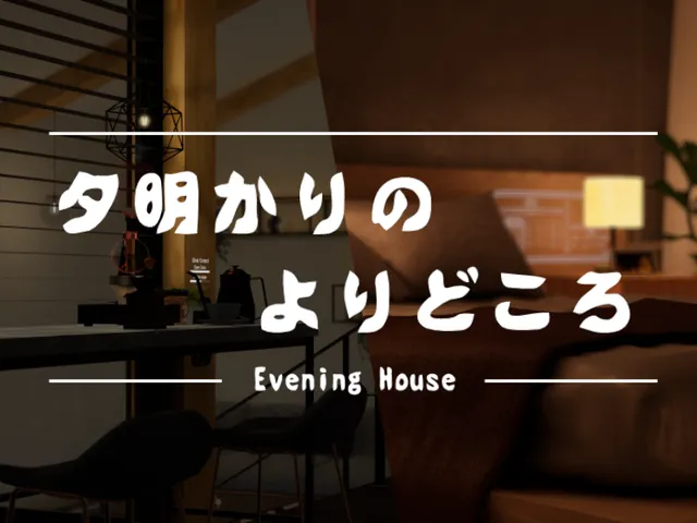 「Evening House 夕明かりの寄り処」は 白那 ゆう が制作した VRChat ワールドです。Quest 対応。推奨定員 24 人(最大 24 人)。2025年1月31日 公開。2026年3月29日 更新。タグ: sunset、bedroom、chill、sleep。